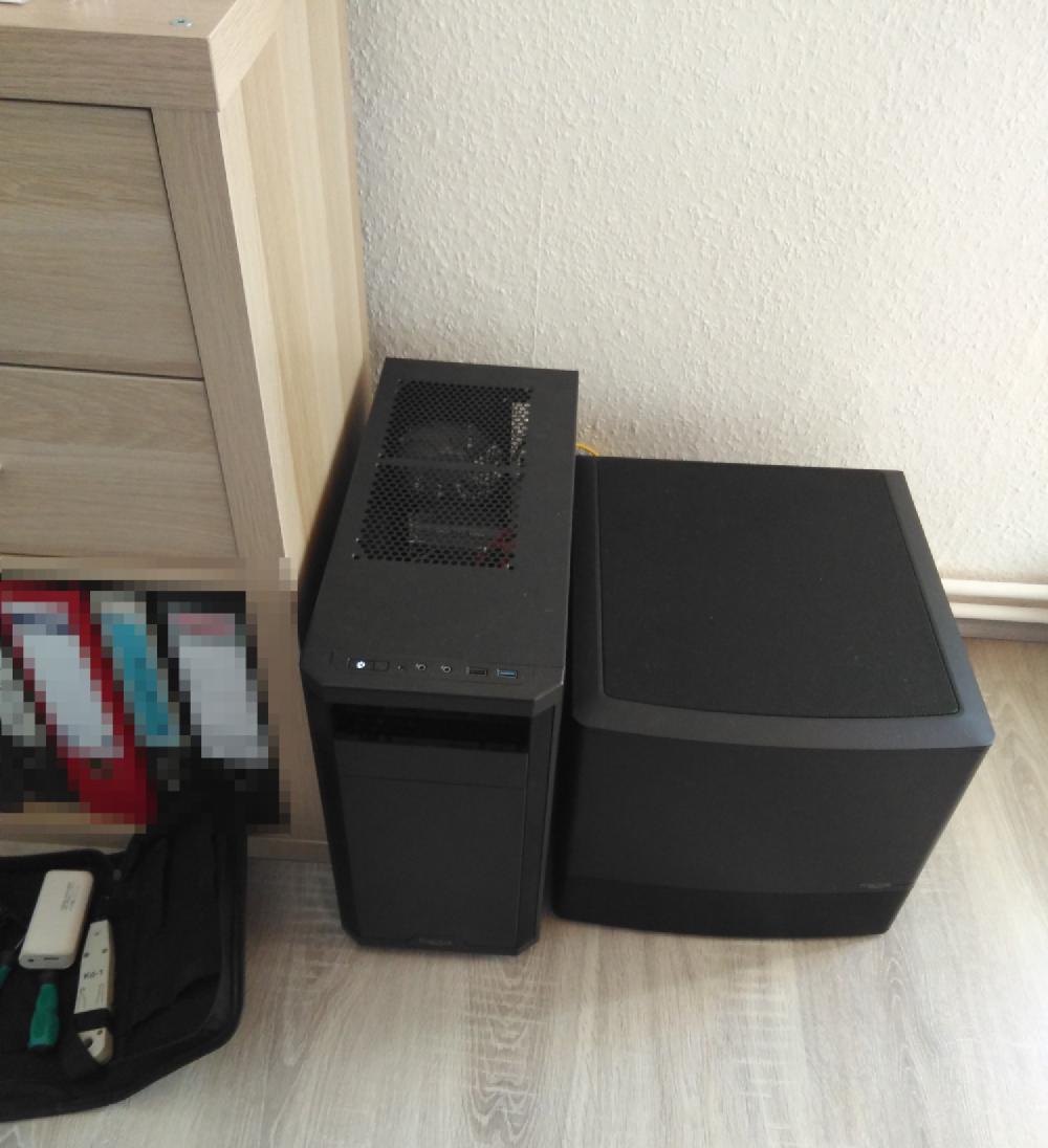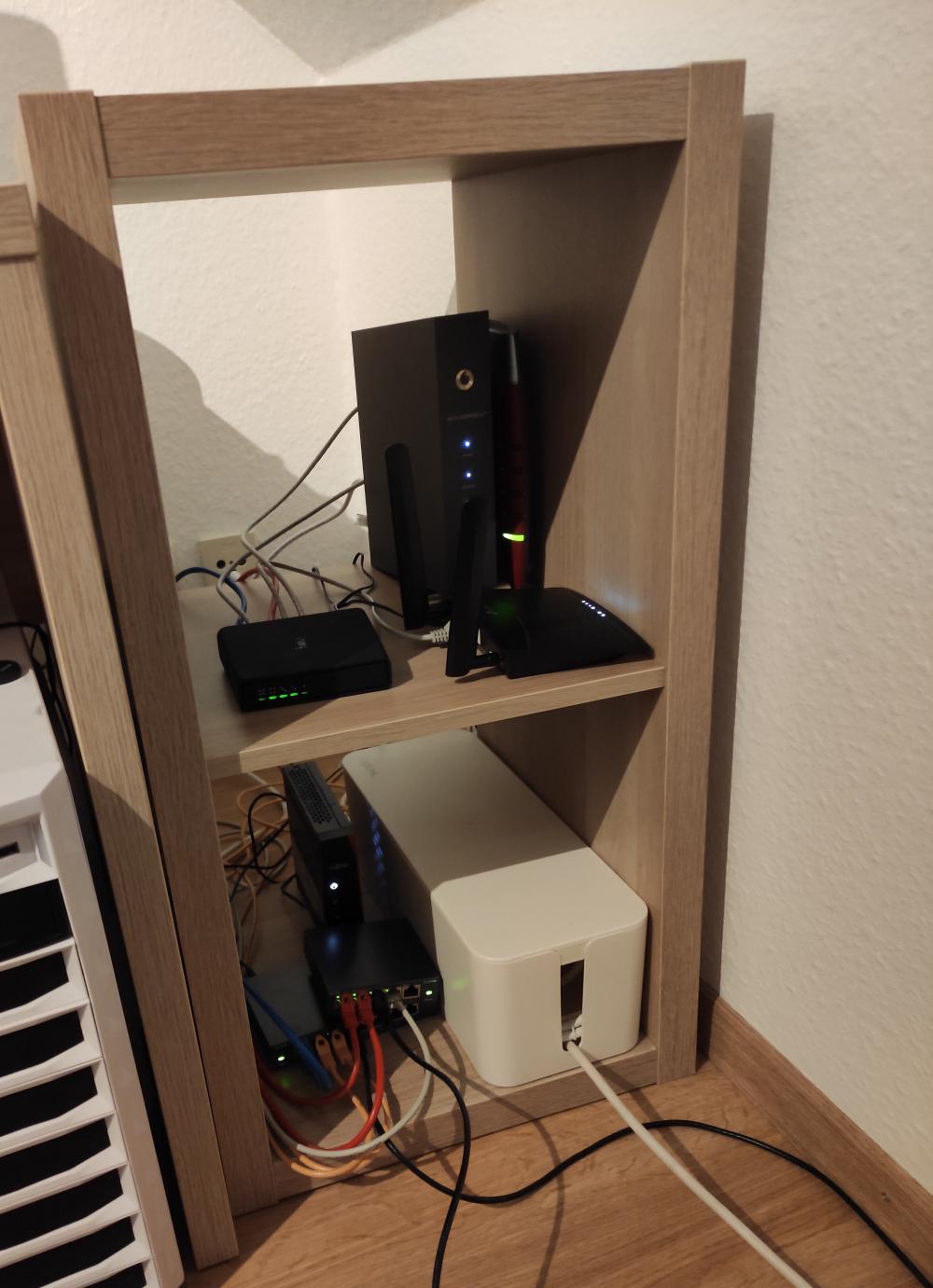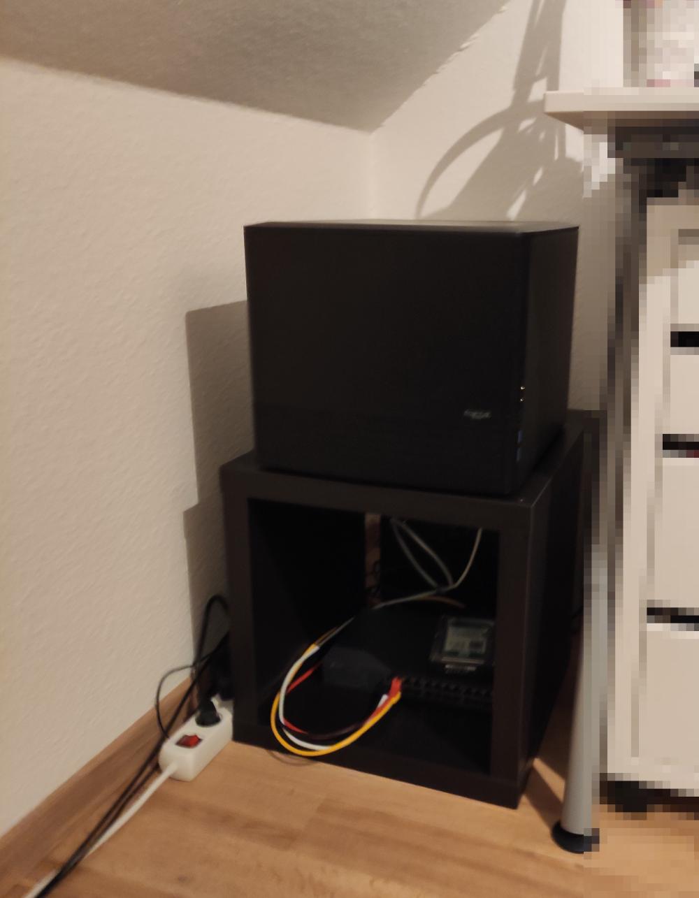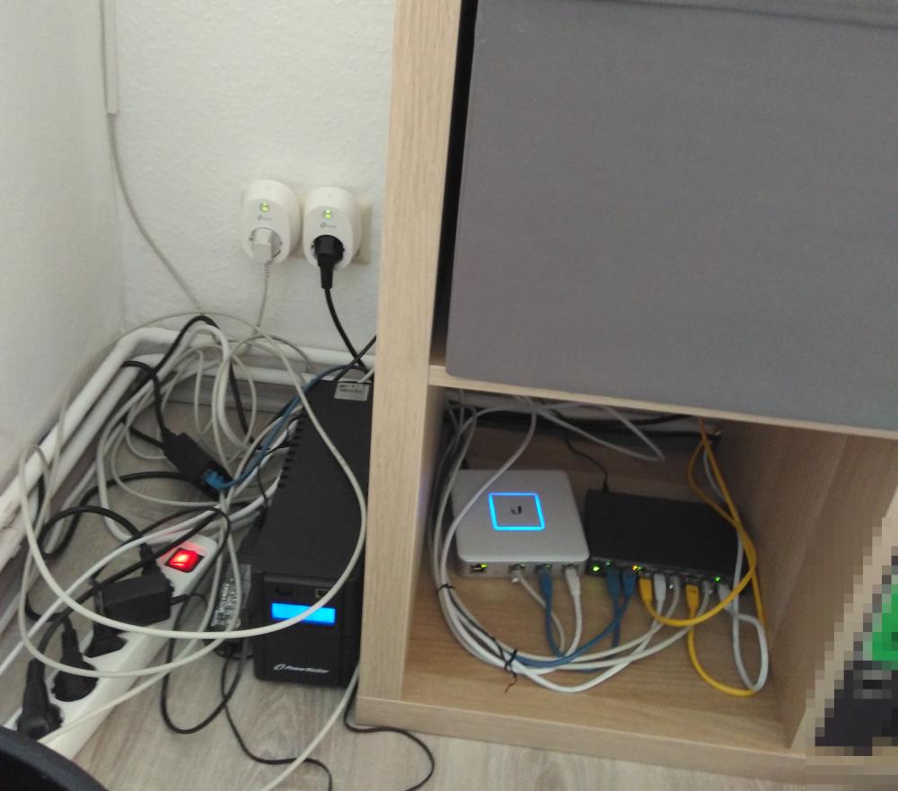 Hiervon habe ich leider kein Bild. Ich habe allerdings in meinem Zimmer im Studentenwohnheim hinter einem Regal einen kleinen Server betrieben. Dieser lief erst mit einem Intel Celeron G1820, dann habe ich via Ebay günstig ein Bundle mit einem Supermicro-Mainboard, einem Intel Xeon E3-1230v3 und 32GB ECC-RAM gekauft und in das Gehäuse gesetzt. Auf dem Server lief u.A. pfSense als Router, daneben noch diverse andere Services - auch hier habe ich leider keine Übersicht mehr, was das genau war. Irgendwann in dem Zeitraum habe ich auch eine einfache USV gekauft.