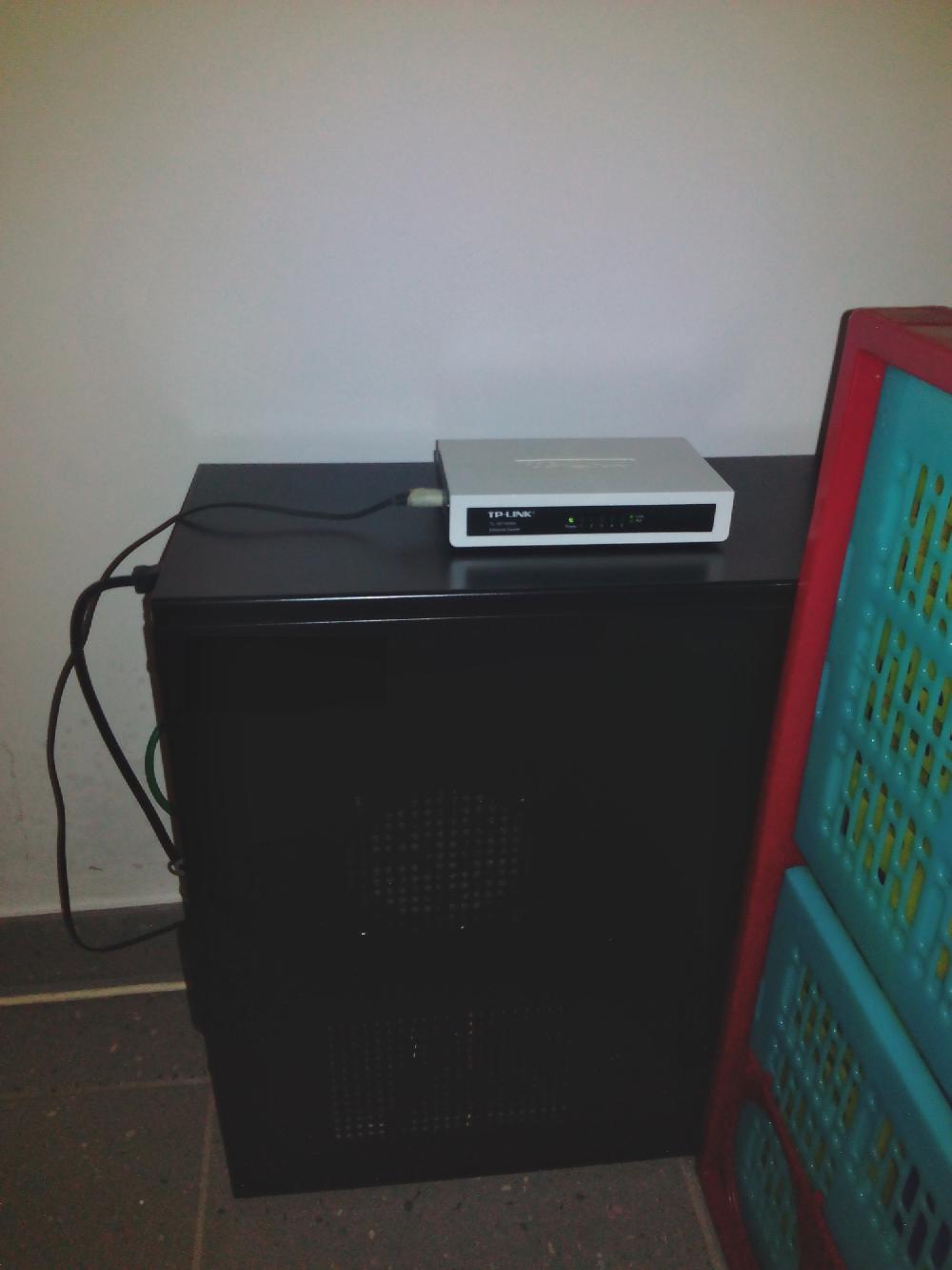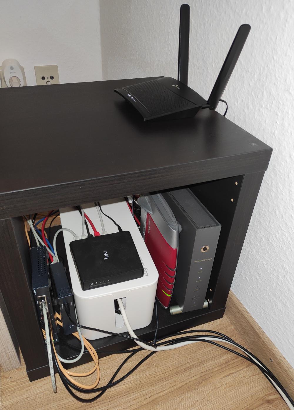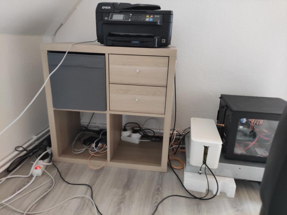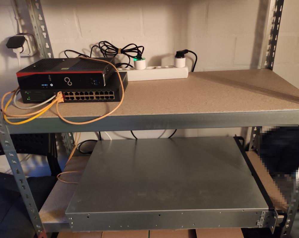Hiervon habe ich leider kein Bild. Ich habe allerdings in meinem Zimmer im Studentenwohnheim hinter einem Regal einen kleinen Server betrieben. Dieser lief erst mit einem Intel Celeron G1820, dann habe ich via Ebay günstig ein Bundle mit einem Supermicro-Mainboard, einem Intel Xeon E3-1230v3 und 32GB ECC-RAM gekauft und in das Gehäuse gesetzt. Auf dem Server lief u.A. pfSense als Router, daneben noch diverse andere Services - auch hier habe ich leider keine Übersicht mehr, was das genau war. Irgendwann in dem Zeitraum habe ich auch eine einfache USV gekauft.