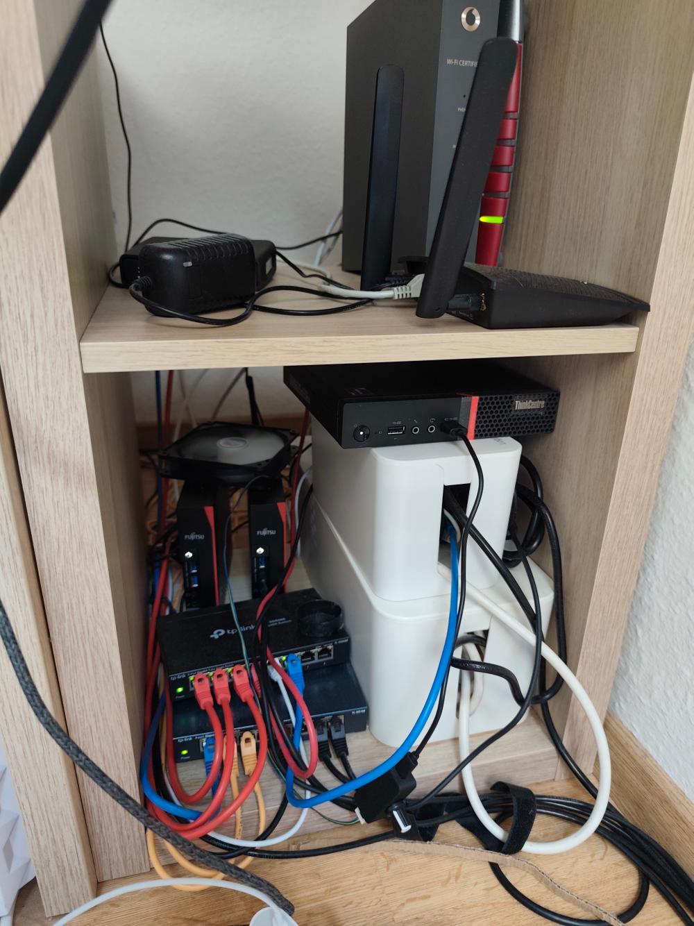 Herbst 2024 kam der zweite Fujitsu Futro S740 und auch ein Lenovo Tinkcenter M715q Tiny dazu, auch habe ich den 5-Port-Switch durch einen 8-Port-Switch ausgetauscht, der neue Switch ist auch VLAN-fähig. Der Lüfter, der auf den Thin Clients liegt, ist auch neu - der war notwendig, da die SSDs bei beiden Thin Clients mit der Zeit zu warum wurden.